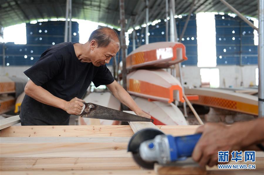 6月14日,在湖南省汨罗市屈子祠镇九子龙屈原龙舟厂内,一名工人在制作龙舟。新华社发(陈振海 摄)