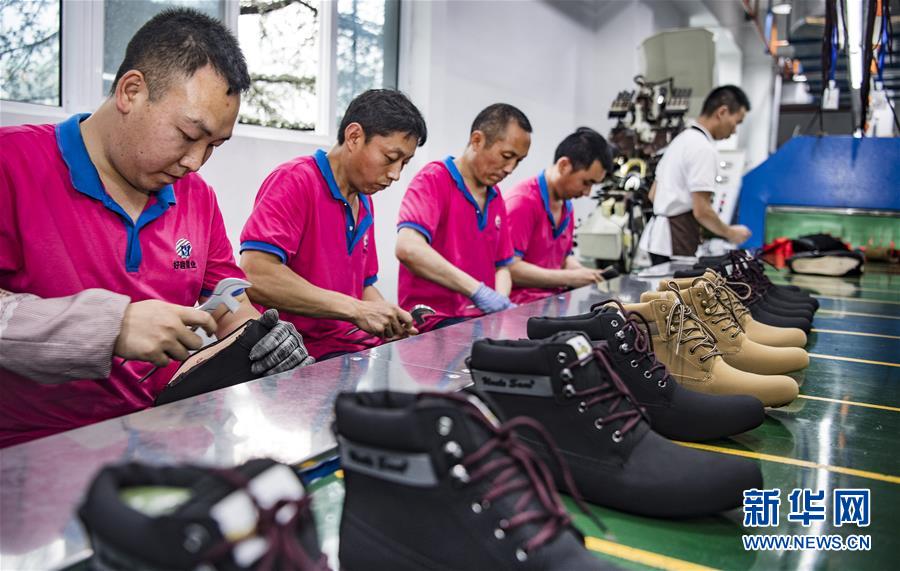 6月27日,岚皋县轻纺工业园区的安康市好运鞋业有限公司的员工在生产线加工产品。该公司解决了当地130人在家门口就业。 新华社记者陶明摄