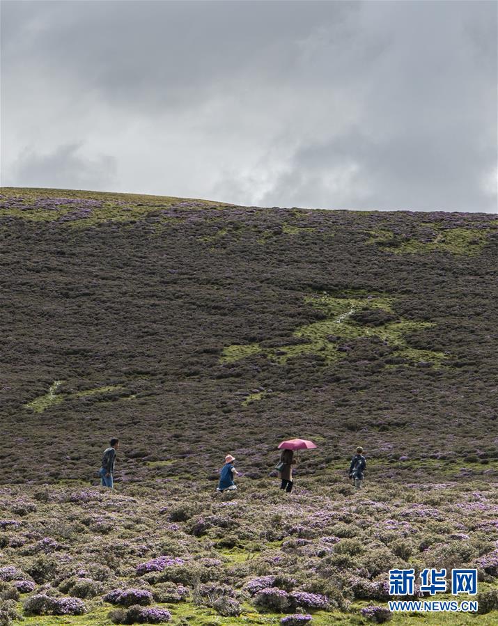 游客徜徉在思金拉错湖边的花丛里(6月26日摄)。 思金拉错湖位于西藏拉萨市墨竹工卡县,四周群山高耸,湖面海拔约4500米。每年春夏两季,湖畔山花遍地、绿草如茵,吸引不少游客。 新华社记者孙非摄