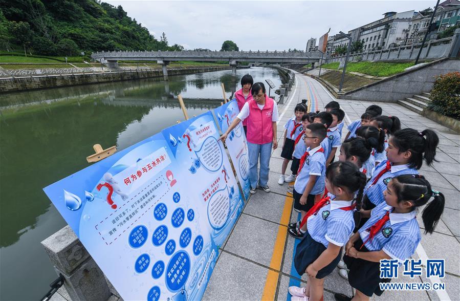 6月28日,杭州市临安区锦城街道纪检部门的党员在苕溪河边给小学生们上“护水”环保课。 临近“七一”,浙江省杭州市临安区锦城街道组织街道党员开展护水清理环境、重温入党誓词、义务献血、直播助农等多项主题党日活动,以党员的先锋模范作用带动群众投入当地的经济、文化、环境建设中。 新华社记者 徐昱 摄