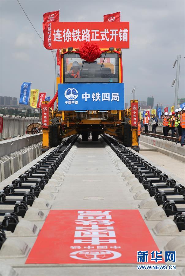 6月28日,工人在连徐高铁连云港站铺轨现场作业。新华社发(王健民 摄)