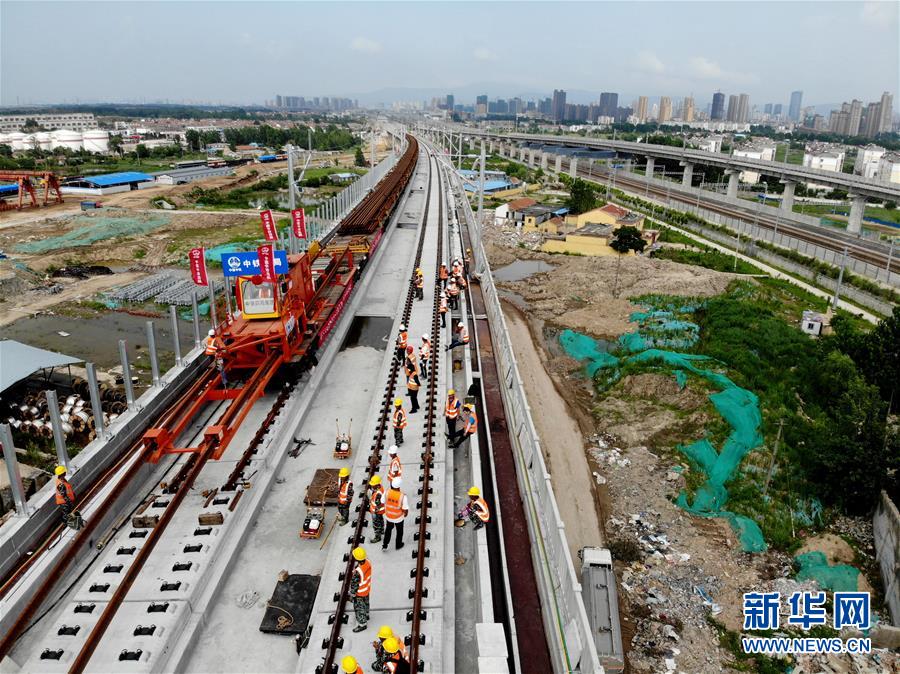6月28日,工人在连徐高铁连云港站铺轨现场作业(无人机照片)。 新华社发(王春 摄)