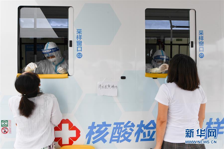 6月28日,在北京市西城区北京展览馆南侧的露天广场核酸检测采样点,核酸检测采样车内的医护人员为前来做检测的人员进行采样。 新华社记者 鞠焕宗 摄
