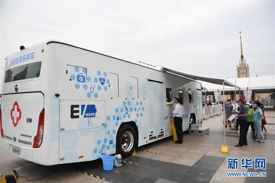 6月28日,在北京市西城区北京展览馆南侧的露天广场核酸检测采样点,前来做检测的人员在核酸检测采样车旁进行采样。 新华社记者 鞠焕宗 摄