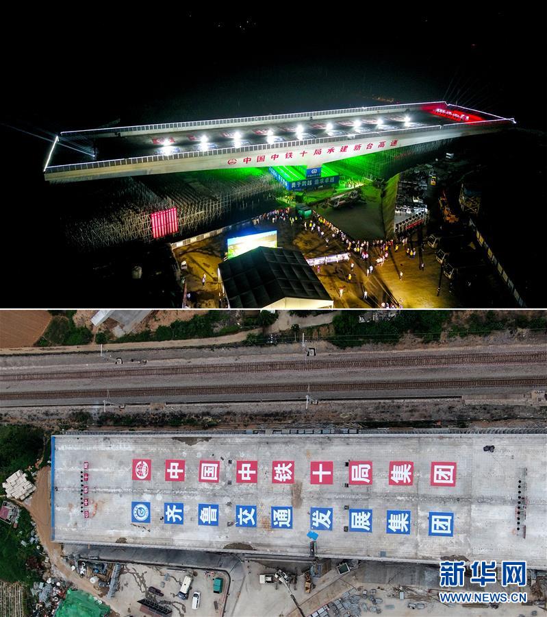 上图:新台高速公路山东平邑段跨兖石铁路转体桥进行转体作业中;下图为跨兖石铁路转体桥实施转体作业前画面(6月28日摄,拼版照片)。新华社记者 郭绪雷 摄