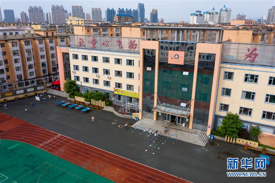 6月29日,在吉林市第一实验小学,学生陆续进入教学楼(无人机照片)。 新华社记者 张楠 摄