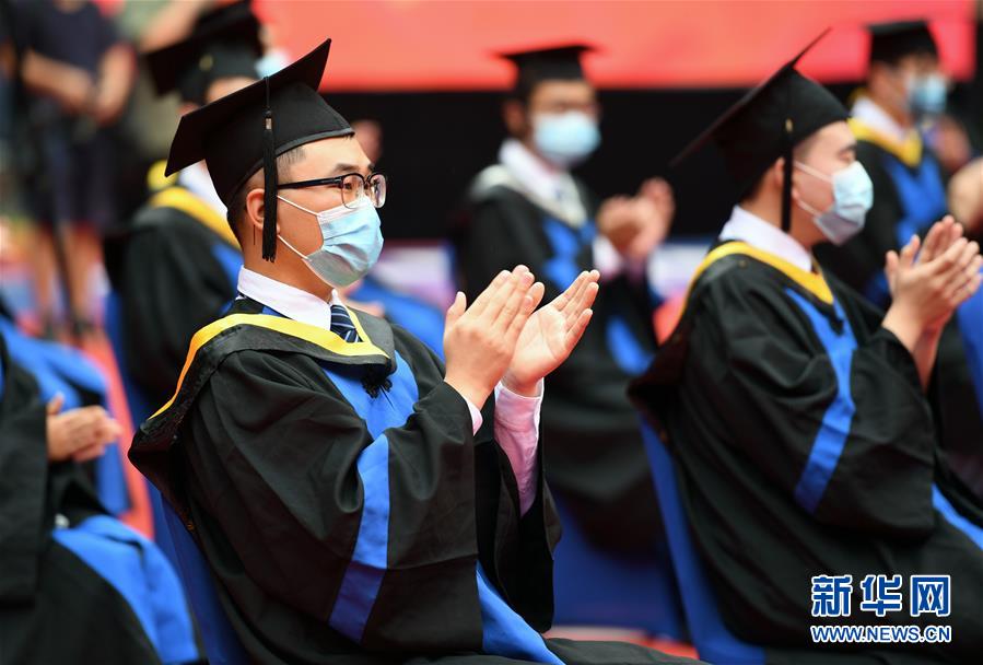 6月29日,北京航空航天大学2020届本科毕业生在毕业典礼上。 当日,北京航空航天大学举行2020届本科生毕业典礼。由于疫情防控需要,今年的典礼在北京航空航天大学主楼广场举行,仅少量在校本科毕业生现场参加,更多本科毕业生通过线上直播参与毕业典礼。 新华社记者 任超 摄