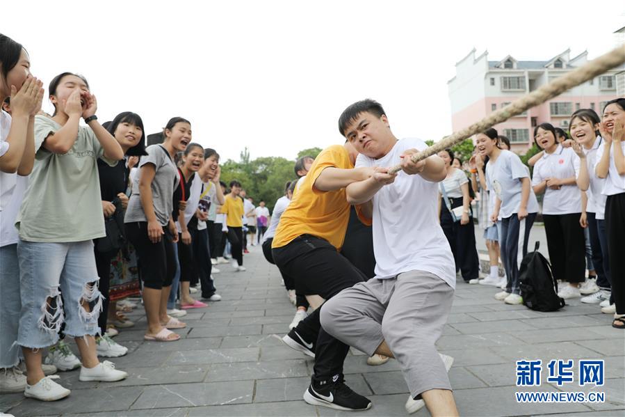 6月28日,在湖南省永州市道县第一中学,学生们在进行拔河比赛。 2020年高考临近,湖南省永州市道县第一中学通过开展形式多样的集体减压活动,帮助高三学生释放身心压力,轻松迎考。 新华社发(何红福 摄)