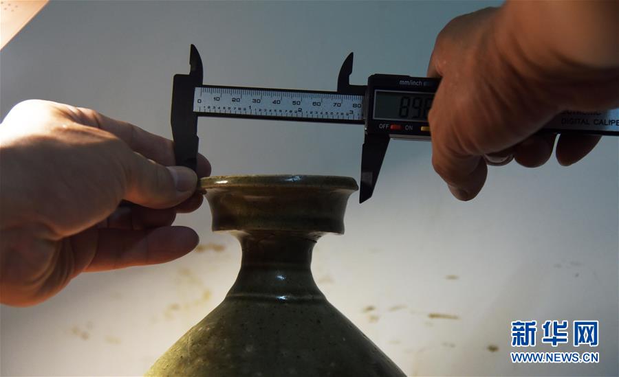 6月29日,济南市考古研究所专家在对小清河复航工程合庄墓地考古发掘出土的文物进行测量。 日前,山东小清河复航工程合庄墓地考古发掘出土文物进入修复和研究过程,济南市考古研究所专家在精细修复文物的基础上对其进行深入研究。 新华社记者 王凯 摄