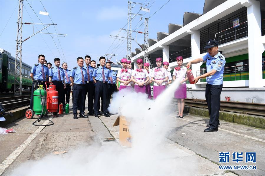 6月29日,重庆铁路公安处消防支队民警(右一)示范使用灭火器灭火。 暑运临近,重庆铁路公安处消防支队、重庆客运段动车三队、重庆车辆段重庆北运用车间在重庆北客整所联合开展消防应急演练活动,增强铁路职工消防安全意识,提高职工应对安全事故和突发事件应急处置能力。 新华社记者 唐奕 摄