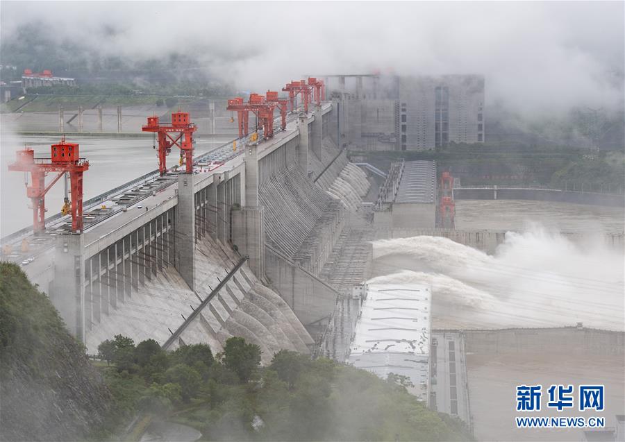 6月29日,三峡枢纽开启泄洪孔泄洪。 受长江中上游强降雨影响,进入三峡水库的水量持续增多。为腾出一定库容迎接近期可能到来的洪水,三峡枢纽于6月29日上午开启两个泄洪孔,加大下泄流量。这是三峡枢纽今年首次泄洪。 28日14时,三峡水库入库流量达4万立方米/秒,是27日14时的两倍。为应对此轮来水,长江防总要求将三峡水库下泄流量上调至日均3.5万立方米/秒。 新华社发(郑家裕 摄)