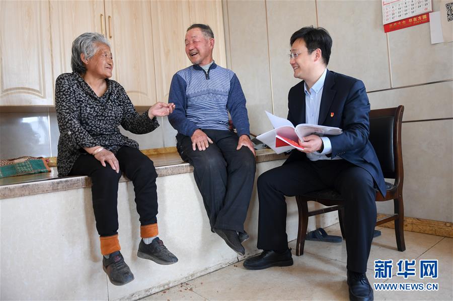 4月30日,张骅(右)在远新村村民高玉良(中)家中走访。 新华社记者 刘磊 摄