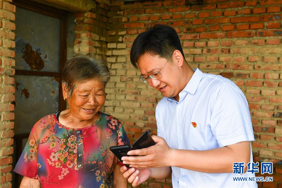 6月29日,张骅(右)在远新村村民邱凤芹家中走访。邱凤芹一家曾是贫困户,在张骅和村里其他干部的带领下,通过发展庭院经济、参与庭院养殖扶贫模式,已顺利脱贫。 新华社发(贝赫 摄)