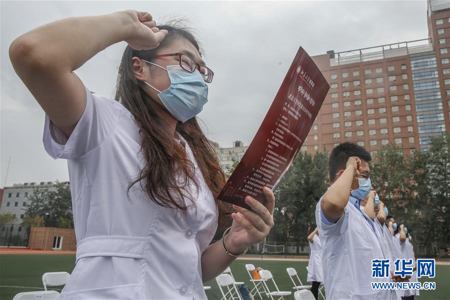6月29日,毕业生在活动上重温医学生誓言。 当日,以“不惧风雨 勇挑重担 绽放青春”为主题的北京大学医学部2020年毕业典礼在线下线上同步举行。北大医学部设立主会场,各学院、附属医院、教学医院设分会场,各地的师生和亲友通过“云端”参与毕业主题活动。据介绍,医学部今年有2094名毕业生顺利完成学业。 新华社记者 张玉薇 摄