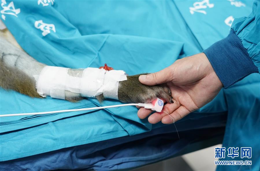 6月29日,研究人员在病房内为移植肝受体猴按摩手部。 日前,多基因编辑猪-恒河猴异种肝、心、肾器官移植在位于陕西西安的空军军医大学西京医院顺利实施。研究团队使用猪内源性逆转录病毒(PERV)敲除的13个基因修饰猪作为供体,将一个供体猪的肝、心、肾分别移植给3只恒河猴受体。目前,移植肝和对应的受体猴已存活16天,突破国际上的猪-猴辅助性肝移植最长存活时间记录。这项研究有助于未来解决器官短缺造成的临床器官移植发展受限难题。 新华社记者 邵瑞 摄
