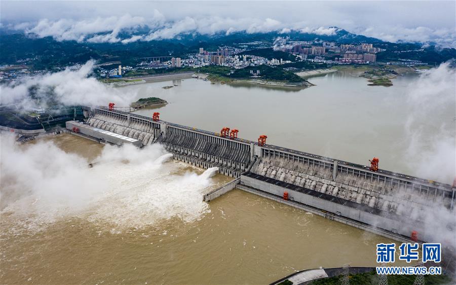 6月29日,三峡枢纽开启泄洪孔泄洪(无人机照片)。 受长江中上游强降雨影响,进入三峡水库的水量持续增多。为腾出一定库容迎接近期可能到来的洪水,三峡枢纽于6月29日上午开启两个泄洪孔,加大下泄流量。这是三峡枢纽今年首次泄洪。 28日14时,三峡水库入库流量达4万立方米/秒,是27日14时的两倍。为应对此轮来水,长江防总要求将三峡水库下泄流量上调至日均3.5万立方米/秒。 新华社发(郑家裕 摄)