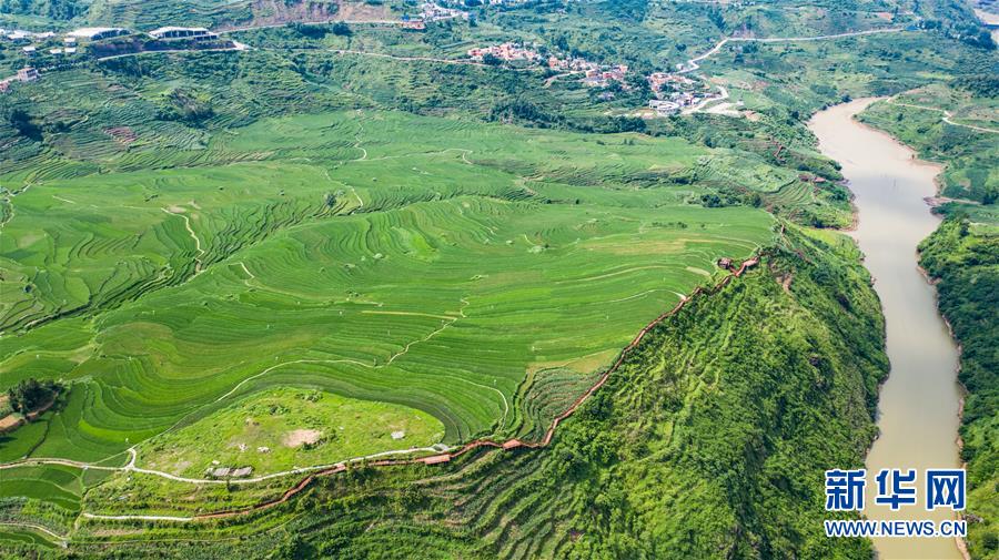 贵州省盘州市新民镇的梯田风光(6月29日摄,无人机照片)。 夏日时节,贵州省盘州市新民镇的梯田风景如画。 新华社记者 陶亮 摄