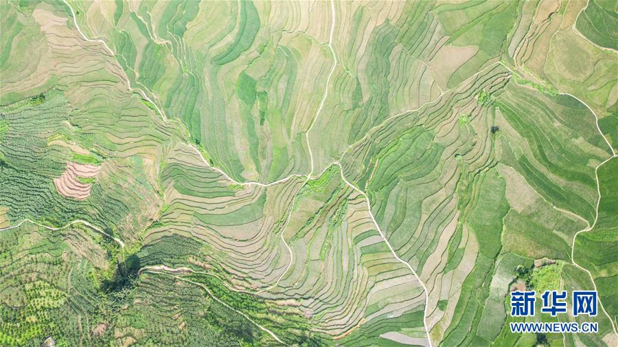 贵州省盘州市新民镇的梯田风光(6月29日摄,无人机照片)。 夏日时节,贵州省盘州市新民镇的梯田风景如画。 新华社记者 陶亮 摄