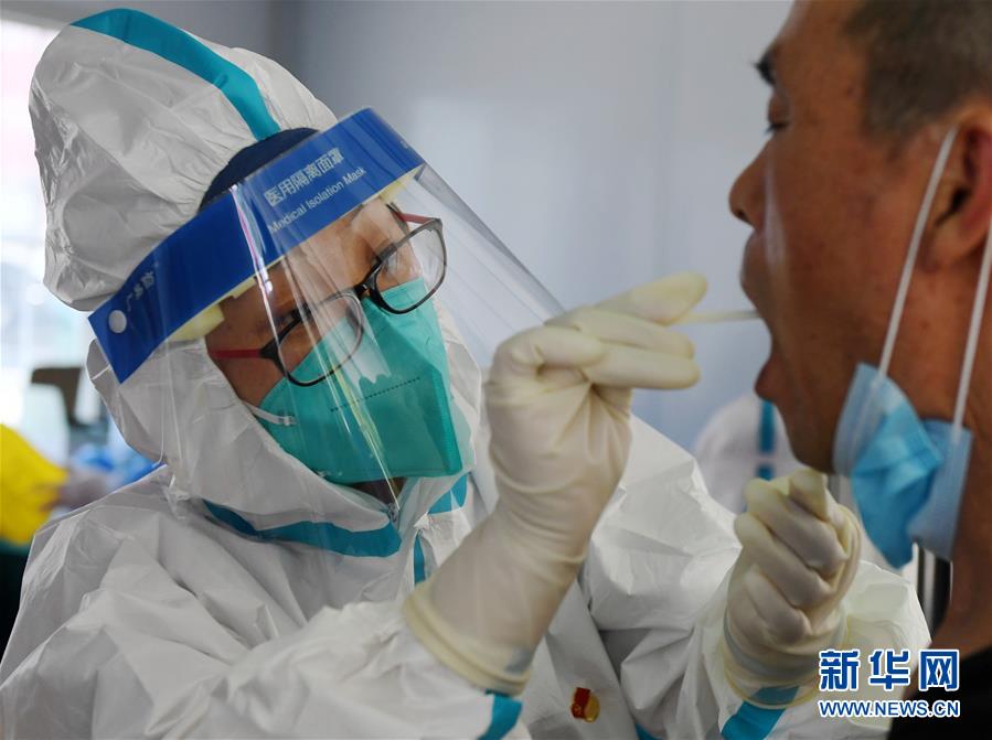 宋亚静在北京市通州区梨园镇公庄小区附近的集中采样点进行核酸检测采样(6月22日摄)。43岁的宋亚静党龄5年,是通州区梨园镇小稿村社区卫生服务站站长,服务站承担着居家隔离人员就医和咨询、社区居民核酸检测、防疫知识培训宣传等工作。 新华社记者 张晨霖 摄