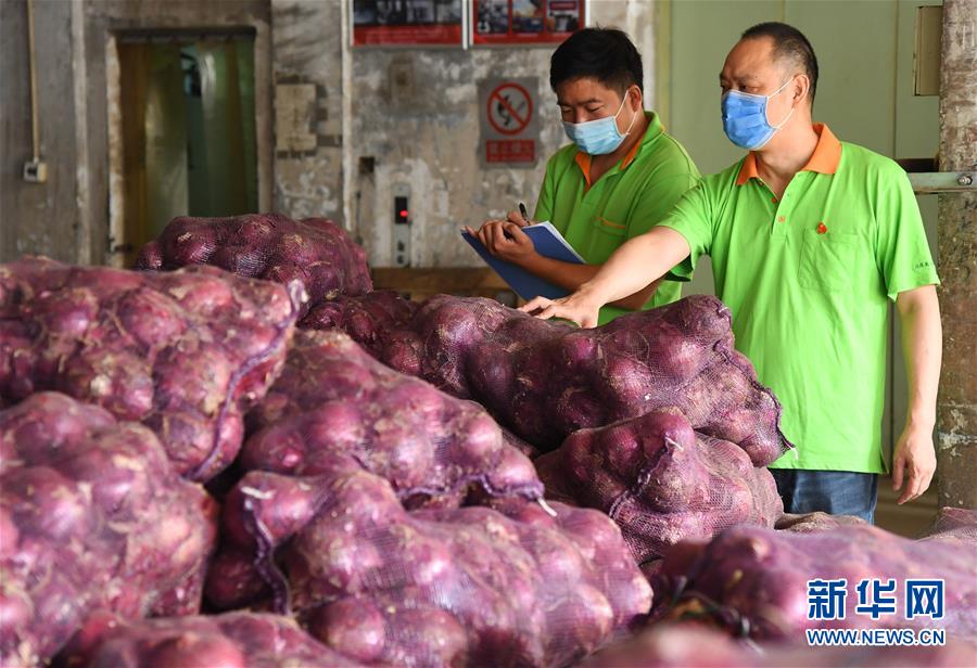 在北京超市发连锁股份有限公司果菜配送中心保鲜库,张云春(右)与仓库管理人员统计新到的洋葱数量(6月28日摄)。50岁的张云春党龄25年,是北京超市发连锁股份有限公司果菜配送中心经理。北京出现新的本地确诊病例之后,张云春和他的团队迅速行动,积极协调货源,缓解供应压力,同时推出15种民生蔬菜限价措施,保障居民生活物资稳定供应。新华社记者 任超 摄