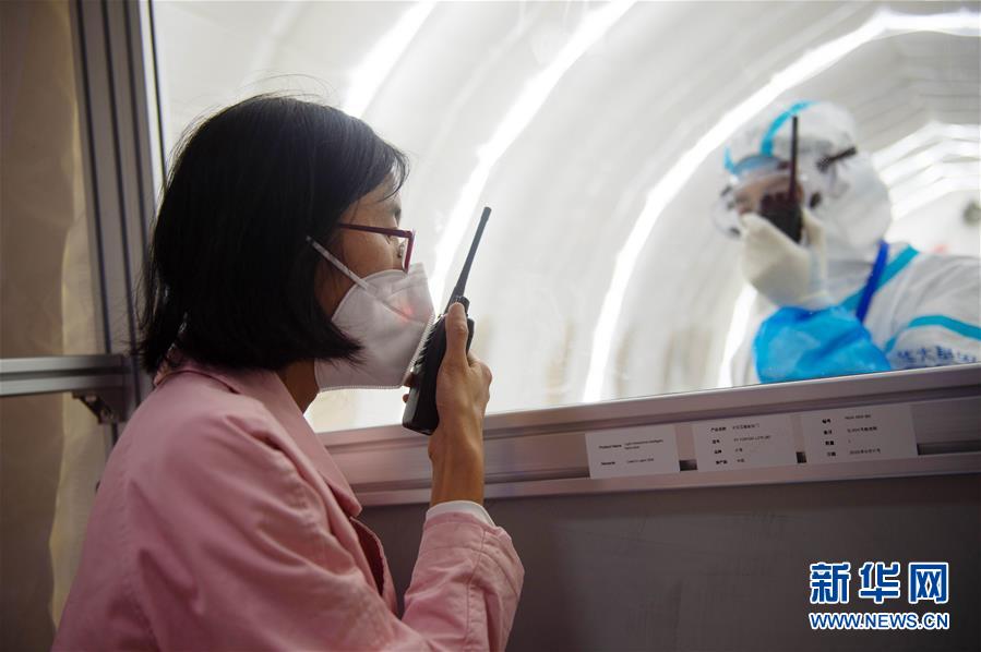 在北京首座气膜版“火眼”核酸检测实验室,马红霞(左)在气膜舱外与舱内的同事通过对讲机交流(6月23日摄)。32岁的马红霞党龄8年,是该实验室样本中心负责人。新冠肺炎疫情发生伊始,马红霞作为武汉华大医学检验所有限公司样本中心负责人,一直在武汉进行核酸检测工作。6月份,她又来到北京抗“疫”一线,负责样本的接收、灭活、信息核对、入库等工作。马红霞带领团队每天接收、处理样本数万份。新华社发(陈钟昊 摄)