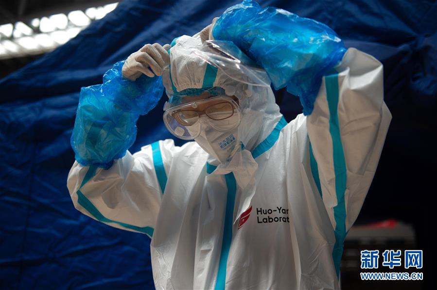 在北京首座气膜版“火眼”核酸检测实验室,马红霞在进入气膜舱前穿戴防护装备(6月23日摄)。32岁的马红霞党龄8年,是该实验室样本中心负责人。新冠肺炎疫情发生伊始,马红霞作为武汉华大医学检验所有限公司样本中心负责人,一直在武汉进行核酸检测工作。6月份,她又来到北京抗“疫”一线,负责样本的接收、灭活、信息核对、入库等工作。马红霞带领团队每天接收、处理样本数万份。 新华社发(陈钟昊 摄)
