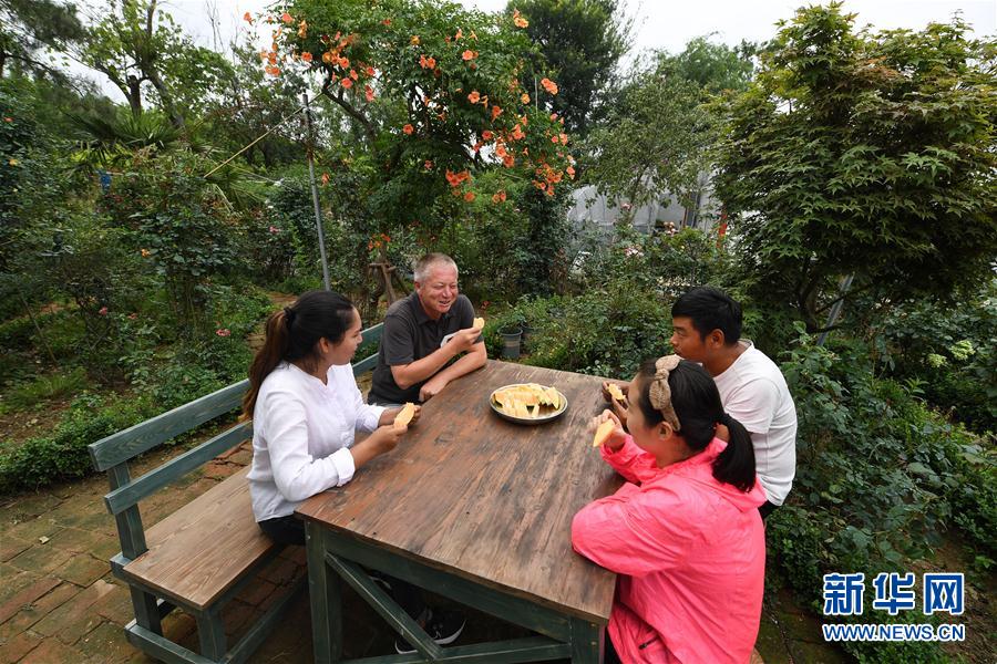 在沭阳县扎下镇,米尔扎提·吾马尔(左二)和妻子早然木·吐尔逊(左一)与合伙人孙栋(右上)、胡婷婷在月季种植基地品尝哈密瓜(6月22日摄)。 在“花木之乡”江苏沭阳县,来自新疆伽师县的米尔扎提·吾马尔和妻子早然木·吐尔逊已经“扎根取经”一年有余,他们在扎下镇流转了20多亩土地,种植月季花,学习现代农业技术。 今年44岁的米尔扎提是名老资历的花商,22岁便在家乡开过花店,南下广州做过多年的花卉批发生意。6年前他慕名来到沭阳进货,从此与这片土地结下不解之缘。“那几年,我每年春秋两季都会到这里进货,一次呆上半个月。”米尔扎提被沭阳先进的花木种植技术吸引,决定留下。家乡许多人想通过种月季脱贫致富,需要这里的技术。2019年初,在当地政府的帮助和支持下,米尔扎提和当地合伙人一起开始了全新的事业。 学技术学管理,打理月季园,线上直播“带货”…… 米尔扎提夫妇每天忙忙碌碌,生意也小有所成。他们将扎下镇的月季花苗卖到新疆各地,也将技术通过直播平台、公众号传授给乡亲。“一人富不算富,大家富才是真的富。”一些乡亲甚至跑到扎下镇来,跟着米尔扎提学种月季。米尔扎提介绍,他前后一共带动了新疆500多户农户种植月季,其中有100多户贫困户,有一些已经脱贫。对来学技术的贫困户,米尔扎提为他们报销往返路费,包吃包住之外还支付生活费,学成了可以留下来,返回新疆的,也提供苗木、资金等帮助。 “我的家乡在‘一带一路’上,希望事业能做得越来越大,将来把月季卖到欧洲去。”谈到未来,米尔扎提信心十足。 新华社记者 季春鹏 摄