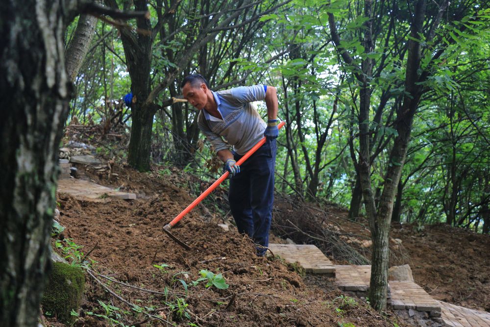 在黔西南州兴义市洒金街道林下菌药产业种植基地,易地扶贫搬迁“新市民”梁显高在基地里平整土地。新华社记者 郑明鸿 摄