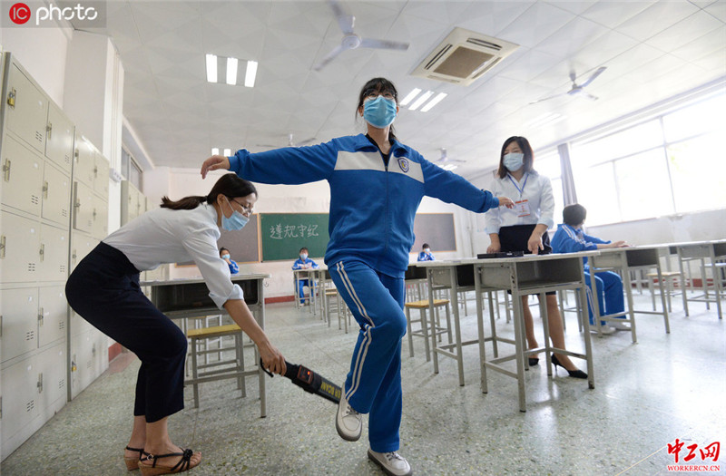 2020年7月1日,在河北省邯郸市第三中学“全真模拟高考”现场,“监考老师”对考生进行检查。