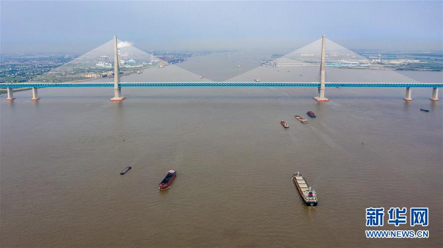 这是7月1日拍摄的沪苏通长江公铁大桥(无人机照片)。 当日,沪苏通长江公铁大桥正式开通,该桥是集合高速公路、客货混线铁路和高速铁路“三合一”的过江通道。 新华社记者 李博 摄