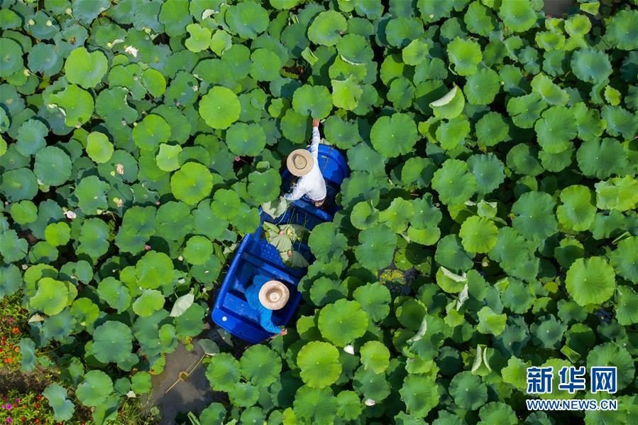 7月1日,村民乘船在马鸣村百亩荷塘内采摘荷叶荷花。新华社记者 徐昱 摄
