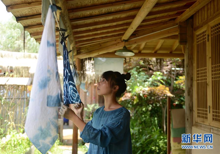 6月30日,陈燃在染坊内晾晒蓝染作品。 新华社记者 韩晓雨 摄