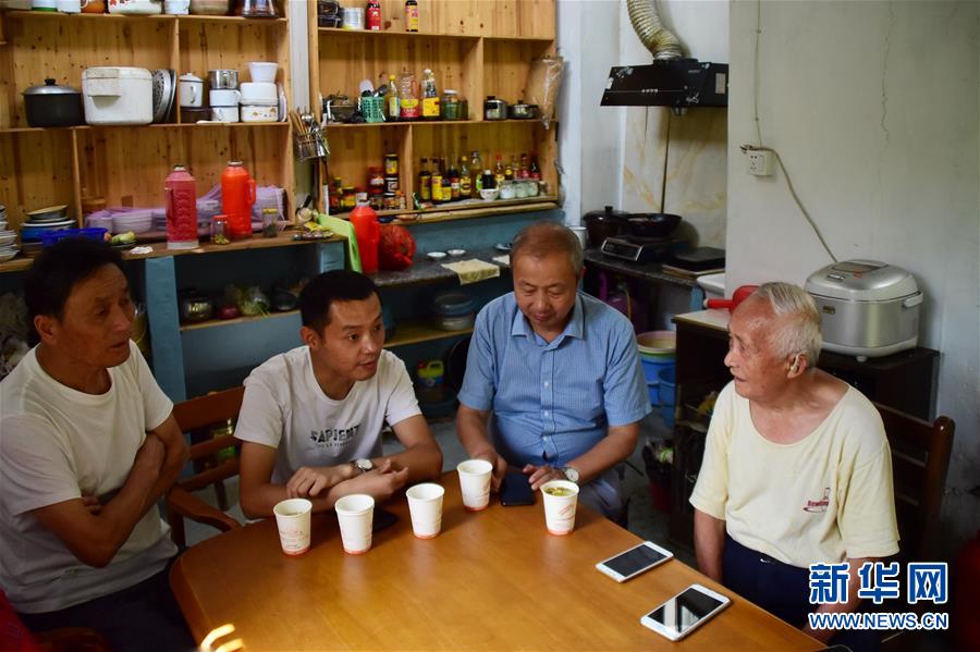 6月30日,第二代放映人朱文炳(左一)、第四代放映人朱强(左二)与第三代放映人朱生荣(右二)来看望第一代放映人王志华(右一)。新华社记者 郑梦雨 摄
