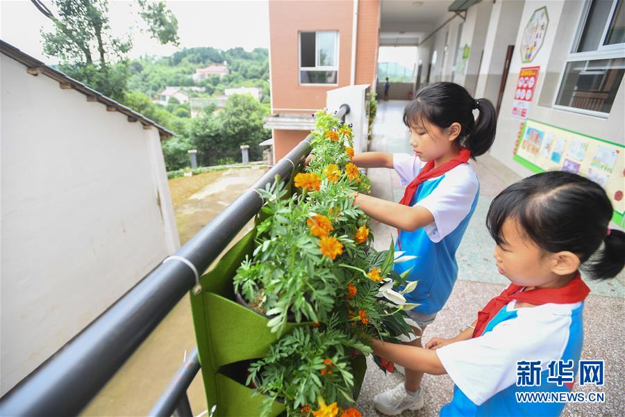 7月1日,长沙市雨花区梅怡岭小学的孩子们用花草布置教室外的阳台。 近年来,湖南省长沙市雨花区教育局根据城区、乡村学校各自的资源优势和风格特色设置劳动实践基地,积极开展中小学劳动实践教育。通过烹饪、种植采摘蔬菜、布置花草、职业体验等多种趣味课程和活动,让孩子们在劳动实践教育中掌握技能,提升素养。 新华社记者 陈泽国 摄