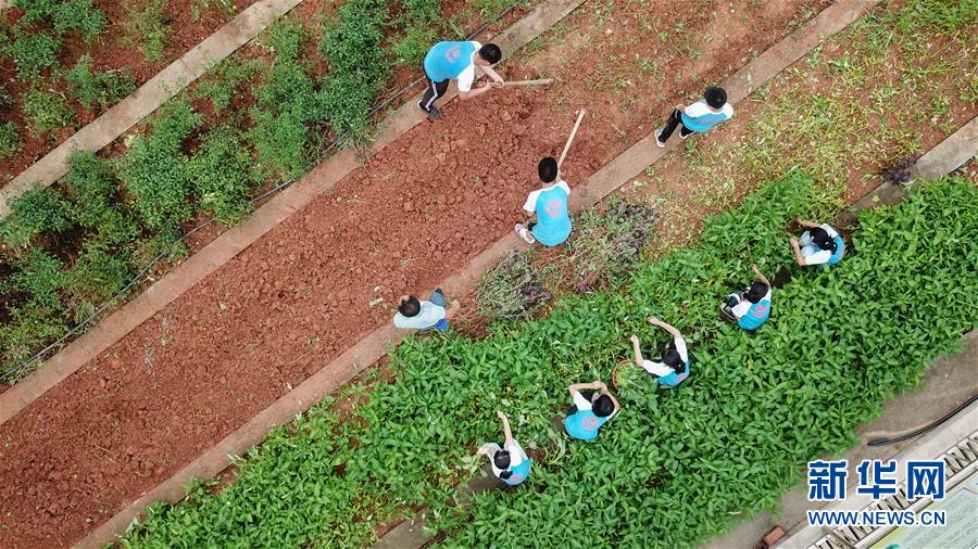 7月1日,长沙市雨花区梅怡岭小学的孩子们在校园的蔬菜种植园中采摘、翻土(无人机照片)。 近年来,湖南省长沙市雨花区教育局根据城区、乡村学校各自的资源优势和风格特色设置劳动实践基地,积极开展中小学劳动实践教育。通过烹饪、种植采摘蔬菜、布置花草、职业体验等多种趣味课程和活动,让孩子们在劳动实践教育中掌握技能,提升素养。 新华社记者 陈泽国 摄