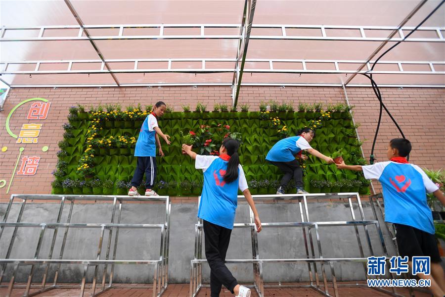 7月1日,长沙市雨花区梅怡岭小学的孩子们在校园的劳动创意实践区使用花草布置背景墙。 近年来,湖南省长沙市雨花区教育局根据城区、乡村学校各自的资源优势和风格特色设置劳动实践基地,积极开展中小学劳动实践教育。通过烹饪、种植采摘蔬菜、布置花草、职业体验等多种趣味课程和活动,让孩子们在劳动实践教育中掌握技能,提升素养。 新华社记者 陈泽国 摄