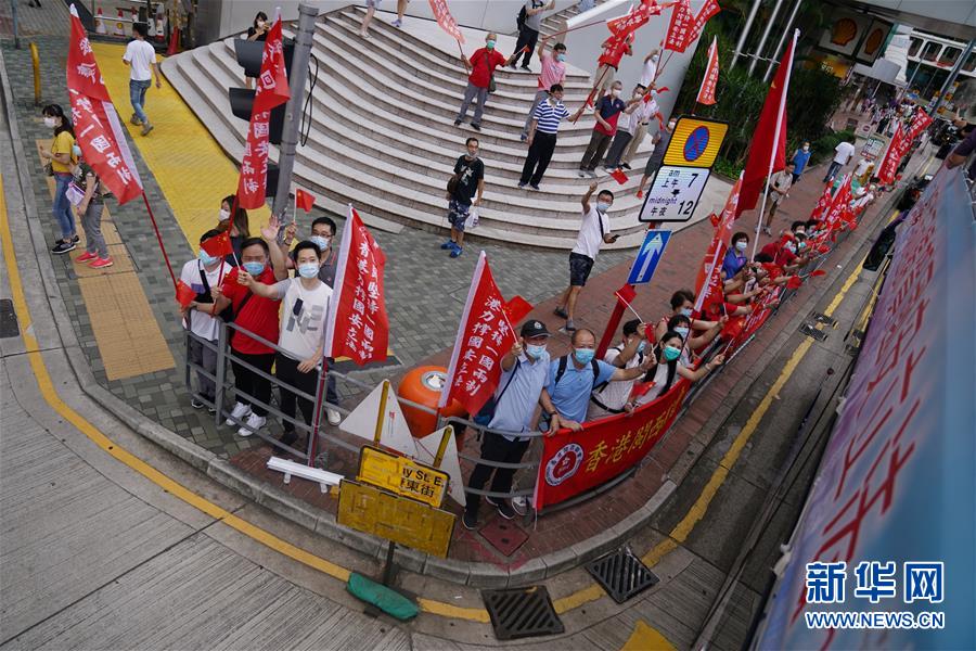 7月1日,市民挥舞国旗、区旗和巡游巴士互动。新华社记者 王申 摄