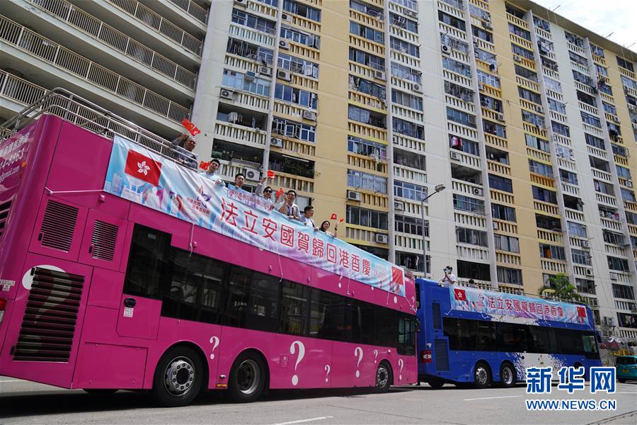 7月1日,嘉宾在敞篷巴士上和市民互动。新华社记者 王申 摄