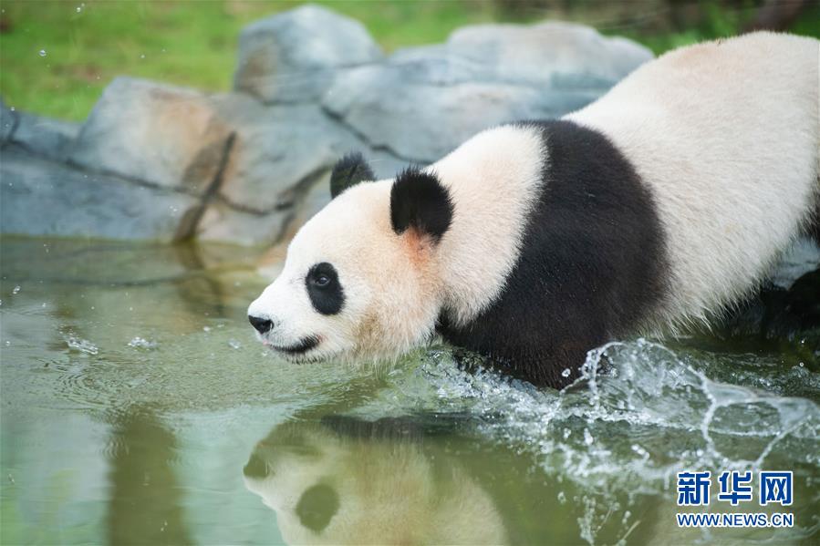 7月1日,在凤凰中华大熊猫苑,大熊猫在戏水。 新华社发(陈思汗摄)