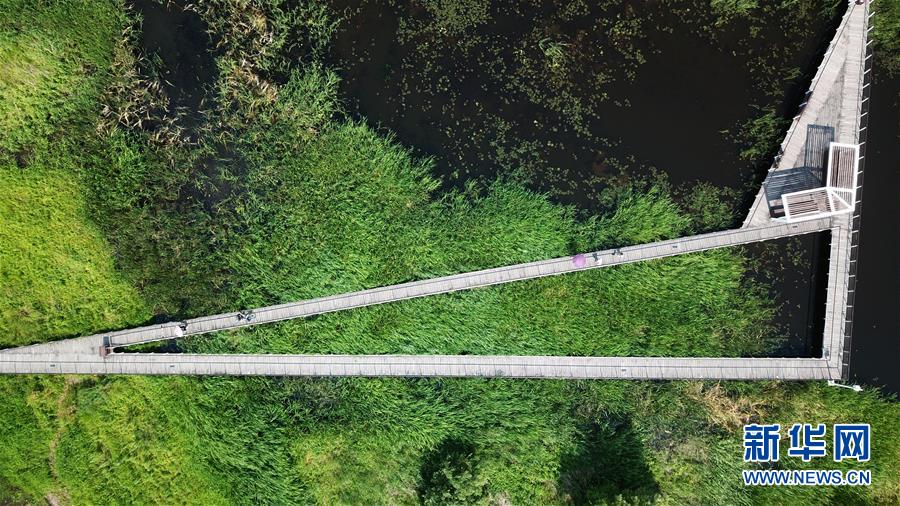 7月1日,市民在哈尔滨文化中心湿地公园游玩(无人机照片)。新华社记者王建威摄