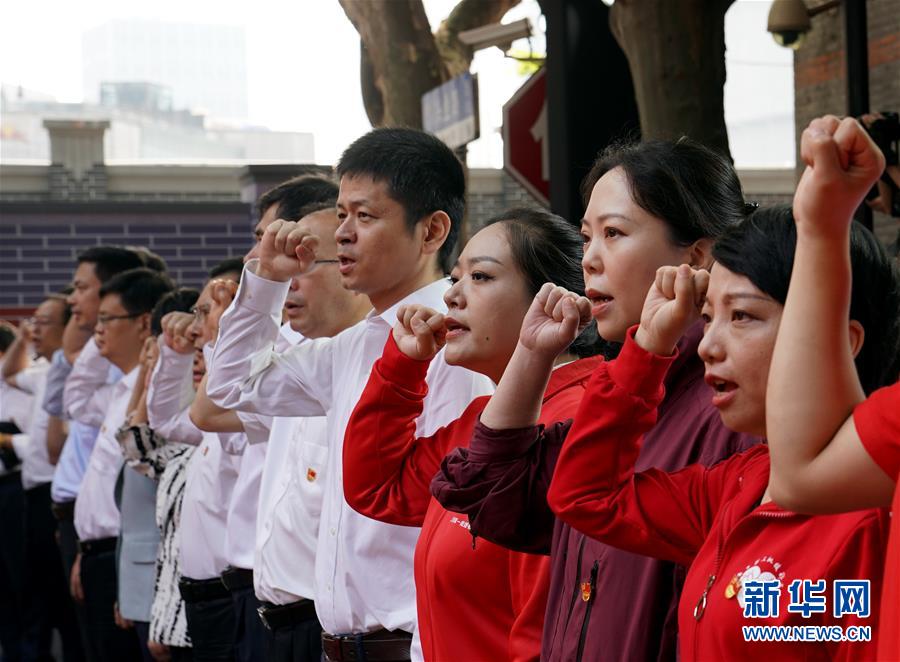 7月1日,来自抗疫一线的党员代表在重温入党誓词。新华社记者 刘颖 摄