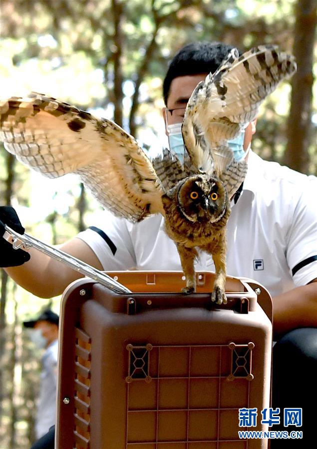 7月1日,吉林省野生动物救护繁育中心工作人员放飞一只长耳鸮。 新华社记者 林宏 摄