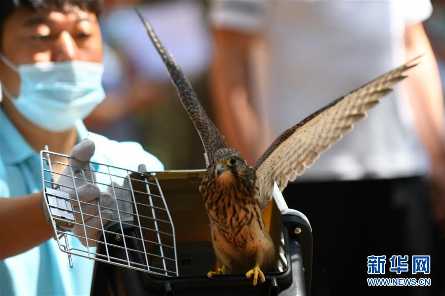 7月1日,在吉林省东北虎园,工作人员放飞一只红隼。 新华社记者 林宏 摄