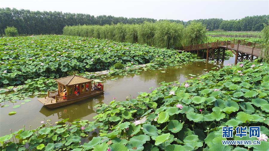 7月1日,游客在河北省香河县刘宋镇万亩荷塘内游览(无人机照片)。 新华社记者 李晓果 摄