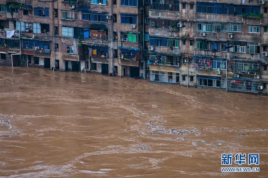 綦江城区部分居民楼被淹(7月1日摄)。 7月1日,重庆綦江区普降大到暴雨,局地大暴雨,最大雨量为107.6毫米。据了解,7月1日,綦江在全区范围启动防汛Ⅲ级应急响应。 新华社发(陈星宇 摄)