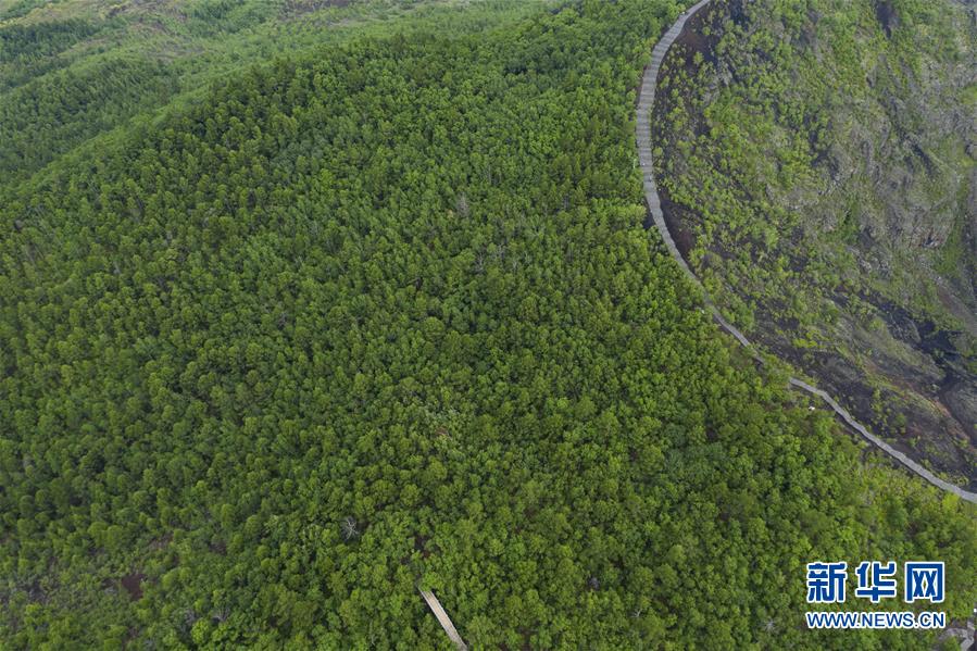 这是7月3日拍摄的五大连池风景区(无人机照片)。 时下,五大连池风景区内植被葱茏,在火山、熔岩台地、火山堰塞湖的映衬下,景色壮美。 五大连池风景区位于黑龙江省黑河市,是较为典型和完整的近代火山喷发遗迹,被喻为“天然的火山博物馆”。 新华社记者 谢剑飞 摄