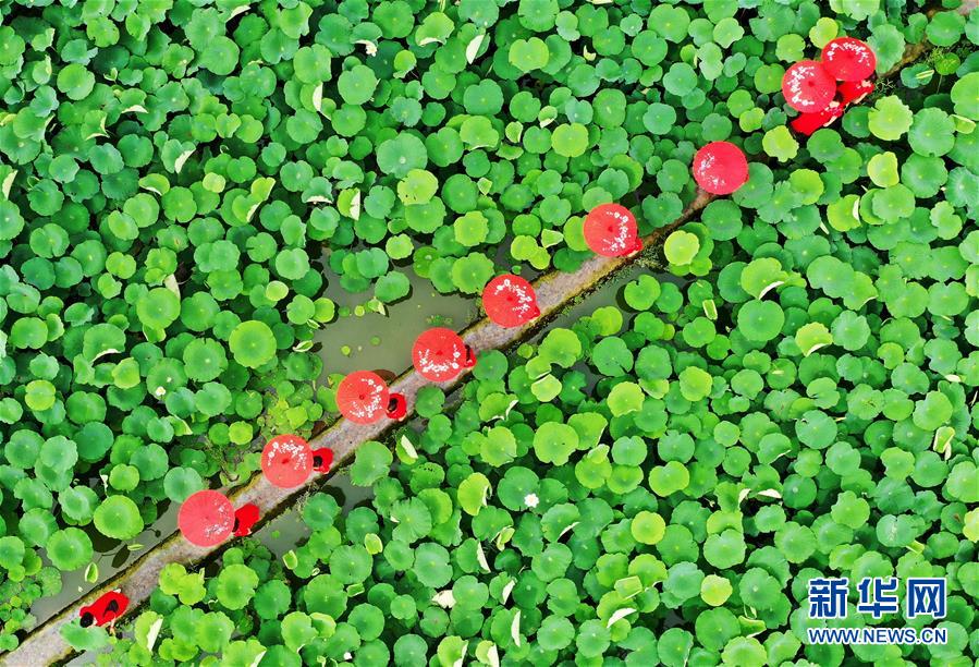 7月3日,游客在曲周县胜丰莲藕种植专业合作社荷塘景区游览(无人机照片)。 时值夏日,河北省曲周县胜丰莲藕种植专业合作社荷塘景区的荷花竞相绽放,吸引众多游人前来观光游览。 新华社记者 王晓 摄