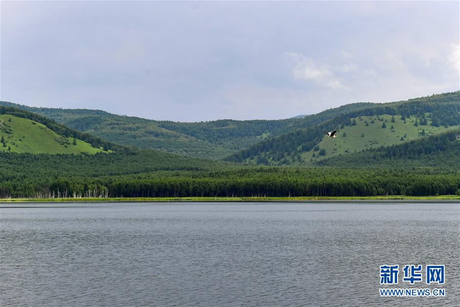 7月3日,一只水鸟飞过阿尔山国家森林公园乌苏浪子湖上空。 夏日时节,内蒙古兴安盟阿尔山市的阿尔山国家森林公园内树木郁郁葱葱,景色宜人。 新华社记者 贝赫 摄