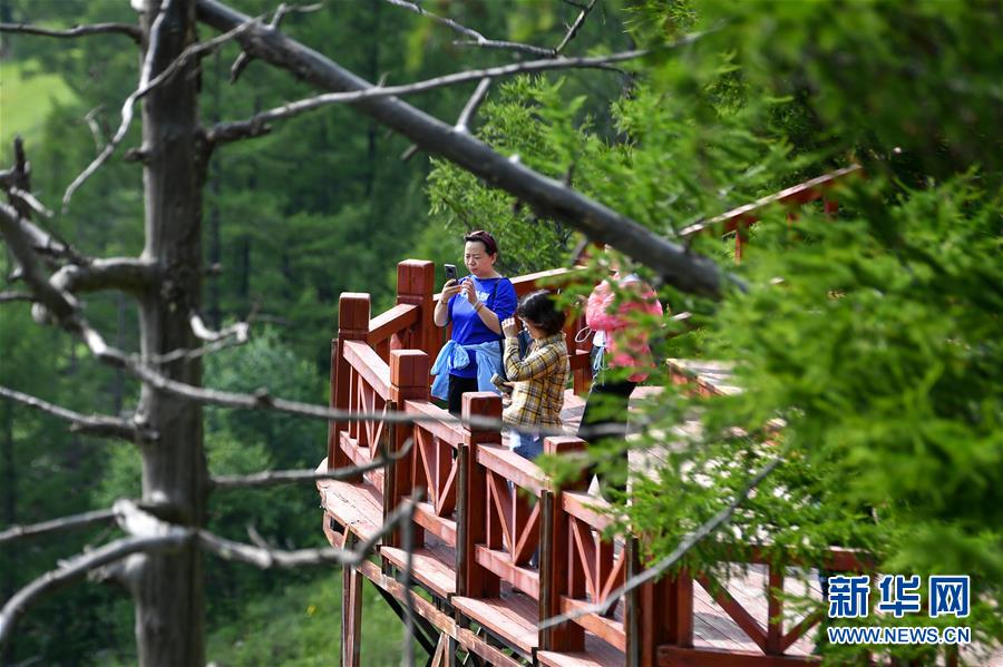 7月3日,游客在阿尔山国家森林公园驼峰岭天池游览。 夏日时节,内蒙古兴安盟阿尔山市的阿尔山国家森林公园内树木郁郁葱葱,景色宜人。 新华社记者 贝赫 摄