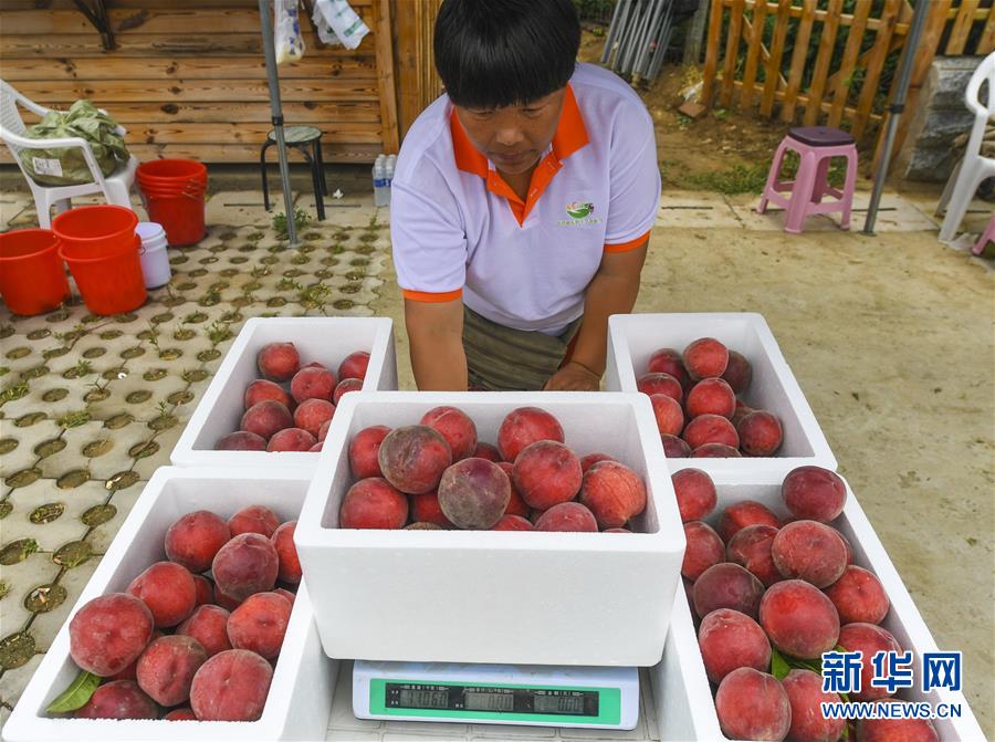 7月3日,河北省大厂回族自治县东杨辛庄村民将鲜桃称重装箱。 近日,河北省大厂回族自治县陈府镇东杨辛庄村千亩采摘园迎来收获季。近年来,该村积极引导农民因地制宜发展以特色种植、生态采摘、旅游观光为亮点的休闲观光农业,打造千亩采摘园,成为远近闻名的种植专业村,带动农民增收。 新华社记者李晓果摄
